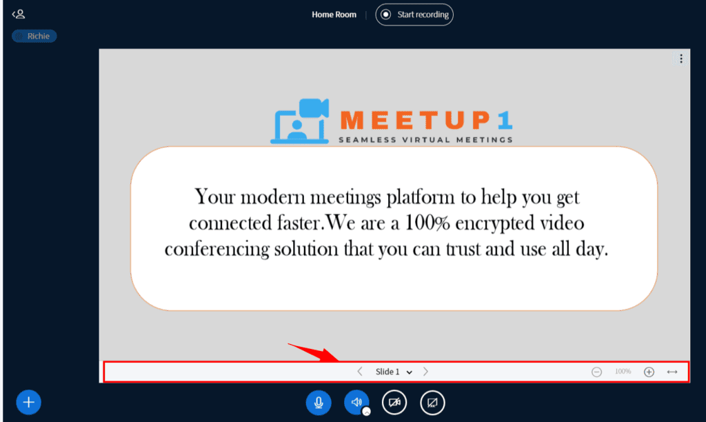 The presenters slide/content control panel is located under the presentation display and above your media control icons.