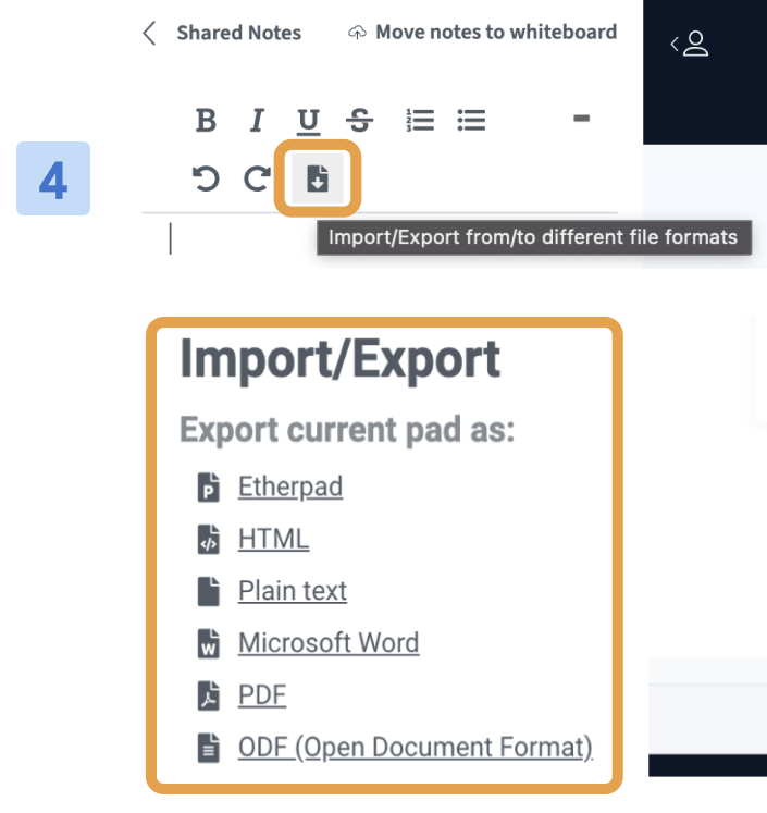 Shared notes enable all the users in a meeting to contribute to a common text based file; you can use formatting options and always export the shared notes anytime.